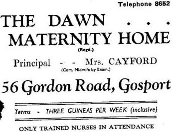 THE DAWN MATERNITY HOME (Regd.) Principal - - Mrs. CAYFORD (Cert. Midwife by Exam.) 56 Gordon Road, Gosport Terms - THREE GUINEAS PER WEEK (inclusive) ONLY TRAINED NURSES IN ATTENDANCE