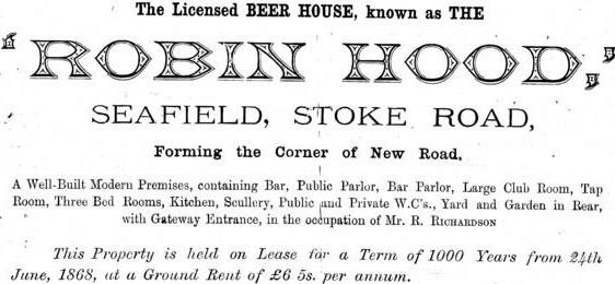 'ROBIN HOOD,' SEAFIELD, STOKE ROAD, Forming the Corner of New Road A Well-Built Modern Premises, containing Bar, Public Parlor, Bar Parlor, Large Club Room, Tap Room, Three Bed Rooms, Kitchen, Scullery, Public and Private W.C's., Yard and Garden in Rear, with Gateway Entrance, in the occupation of Mr. R. Richardson This Property is held on Lease for a Term of 1000 years